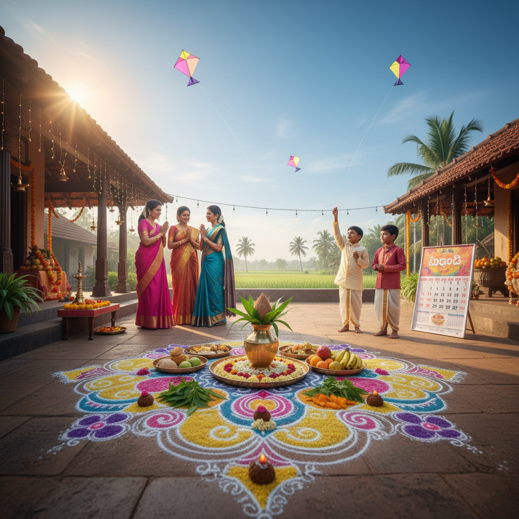 - Auspicious Beginning: The day begins with an oil bath and wearing of new clothes. Homes are cleaned and decorated with fresh mango leaves (Toranams) and colorful Muggulu (rangoli).